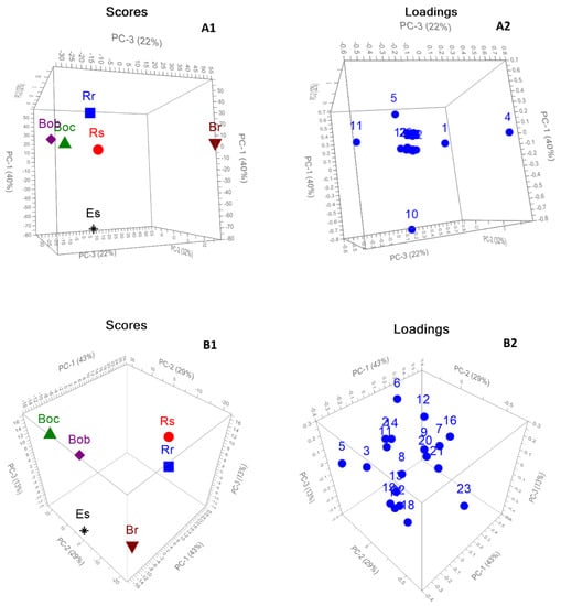 3D PCA score (A1) and loading (A2) plots based on volatile compounds chemical profiling identified by GC-MS of six Brassicaceae seeds. 3D PCA score (B1) and loading (B2) plots based on glucosinolates chemical profiling identified by HPLC of six Brassicaceae seeds.