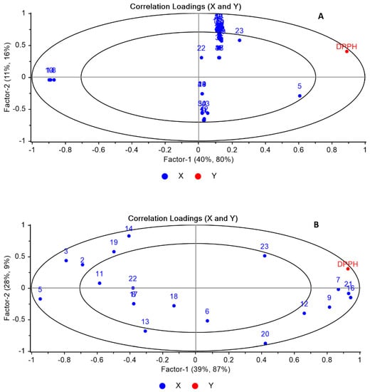 By applying the PLS model, the PLS-R1 model revealed that DPPH did not exhibit a positive correlation with any volatile compound, though, compounds nos. 8, 10, and 14 are negatively correlated with DPPH as shown in Figure 5A. This result displayed that the antioxidant activity is mainly attributed to all the volatile compounds not just a single marker compound. On the contrary, the results of PLS-R2 showed that glucoraphenin, glucoraphasatin, and 4-methoxyglucobrassicin (compound nos. (7, 16, and 21)) were located close to each other and positively correlated with DPPH. This result explains the higher antioxidant activities of both Rr and Rs samples as they contained the highest concentrations of compound nos. 7, 16, and 21 in comparison to other samples. Nevertheless, singrin (compound no. (5)) is negatively correlated with DPPH, and this highlights the lowest antioxidant activities of Boc, Bob, and ES samples as they displayed the maximum amounts. Variables that are very close to the center are not well described by factor 1 and factor 2.