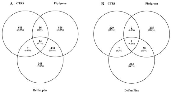 Common and specific differentially expressed genes (FC > 2) in stressed control (CTRS) and treated plants (Phylgreen and Delfan Plus) grouped by the Venn diagram. (A) Upregulated DEGs and (B) downregulated DEGs.