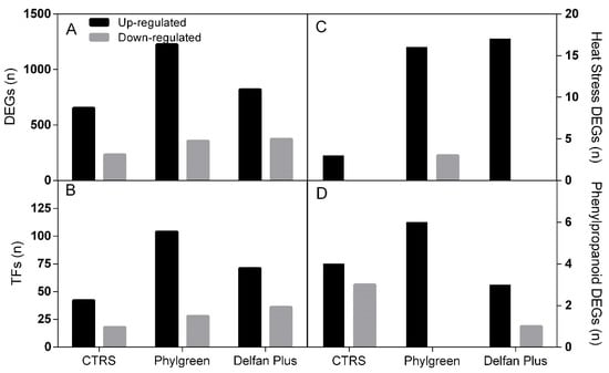 Total differently expressed genes (A), transcription factors (TFs) (B), heat stress-associated genes (C), phenylpropanoids (D) in CTRS, Phylgreen, and Delfan Plus.