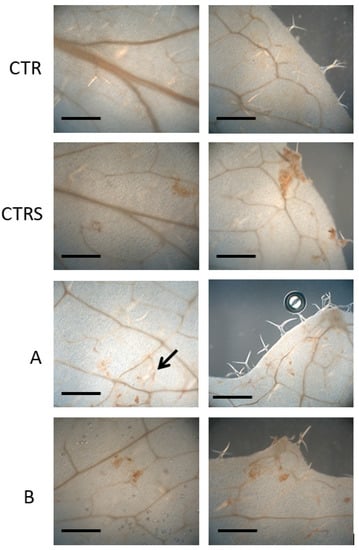 ROS histolocalization by DAB staining on mature leaves. The brown spots represent the sites where ROS are accumulated. For each sample, one picture was taken from the central area of the leaf blade (left) and one from the leaf border (right). CTR: non-stressed control, CTRS: stressed control, A: Phylgreen, B: Delfan Plus. Bars: 500 µm. The arrow indicates the faint signal caused by treatment drops.