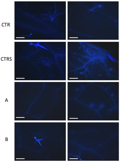 For all the samples, the presence of secondary metabolites of the phenylpropanoid pathway (mainly lignin) and ROS (H2O2) by histochemical analysis on mature leaves, in non-stressed control (CTR), stressed control CTRS, and treated plants were analyzed. ROS were visualized by 3,3’-diaminobenzidine (DAB) staining. DAB is oxidized in the presence of peroxidase and hydrogen peroxide resulting in the deposition of a brown, alcohol-insoluble precipitate at the site of enzymatic activity (Figure 3). The CTR did not show any brown spots. The stressed control CTRS showed several brown spots along the leaf margins and spread onto the leaf blade, indicating the accumulation of ROS in different areas of the leaves. Phylgreen and Delfan Plus application strongly reduced the ROS accumulation and only a few small spots were visible, demonstrating the positive effects of these treatments against heat stress (Figure 4). In particular, leaves treated with Phylgreen (A) and Delfan Plus (B) only showed small patches of DAB signal along the leaf margins or on the leaf blade. It is interesting to note that on the leaf areas reached by the drops of the products Phylgreen and Delfan Plus used to treat the plants, a faint but clear DAB signal was present. Damaged cells induced by heat stress could be visualized using autofluorescence. The intensity of autofluorescence depends on the cell wall composition and construction. Changes in autofluorescence can be used only as a coarse indicator of cell wall products. High autofluorescence signals were found in CTRS, indicating the heat stress damage. In contrast, no damage was found in control plants, while almost no autofluorescence signals were found in two samples treated with Delfan Plus (B) and only a few spots were found in leaves treated with Phylgreen (A) (Figure 4).