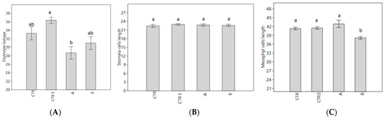 Electrolyte leakage expressed as μS/cm (A), stomata cell length in μm (B), and mesophyll cells in μm, (C). On the x-axis, CTR, CTRS, A: Phylgreen, B: Delfan Plus. Means followed by the same letter are not significantly different (Tukey test, p < 0.05). Data are means of three biological replicates (n = 50). Bars represent standard error.