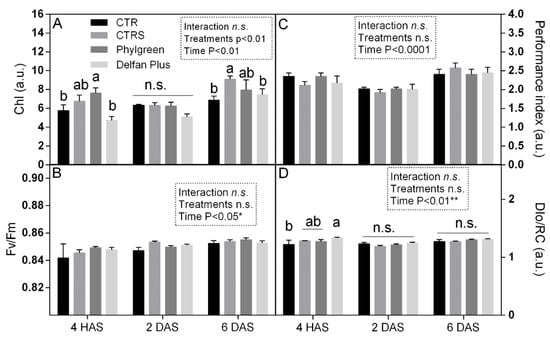Non-destructive chlorophyll content (A), Fv/Fm ratio (B), performance index (C), and DIo/RC (D) measured in Arabidopsis thaliana plants treated in CTR, CTRS, Phylgreen, and Delfan Plus in 3 different moments (4 HAS, 2 and 6 DAS). Data are means with standard errors (n = 5). Statistical analysis was performed using two-way ANOVA and differences amongst means were determined using LSD test. Asterisks indicate significant differences, * for p < 0.05, ** for p < 0.01. In the A and D, significant differences for each timepoint have been highlighted using different letters.