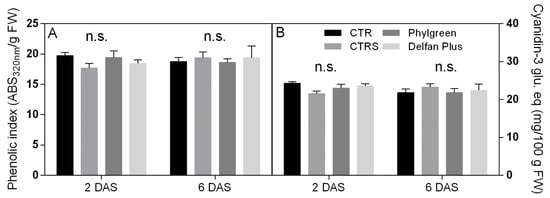 Total phenols expressed as phenolic index (A) and anthocyanin content (B) measured in Arabidopsis thaliana plants (n = 5) treated in CTR, CTRS, Phylgreen, and Delfan Plus. Data were subjected to two-way ANOVA and no differences were found.