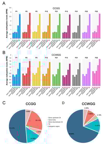 To profile CCGG and CCWGG methylation states in developing seeds of hybrids as compared to their parents, we mapped MethylRAD-Seq reads to the soybean reference genome Wm82.a2.v1. Only uniquely mapped reads were used for further analysis. After alignment, 49,967 CCGG sites and 85,999 CCWGG sites were obtained, respectively. Subsequently, we calculated the average methylation levels (reads per million/RPM) for each sample and for different regions of the genome within each sample. Results showed that the methylation levels of CCWGG sites were significantly less methylated than CCGG sites in all samples (Figure 1A,B and Figure S1D). The most significant reduction of methylation was detected at transposable elements (TE) (Figure 1A,B and Figure S1C). Further analysis of methylation patterns of parents and reciprocal hybrids revealed that levels of CCGG methylation were roughly similar in all examined samples, while CCWGG methylation was significantly different between P3 and its crossing offspring (F13 and F31) and between F32 and its parents or F23 (Figure S2). The mean methylation levels of all hybrids were slightly lower than the corresponding mid-parent value (MPV), except for the levels of F32 at CCWGG sites, and the reason for this was that the methylation levels in whole genome regions at these sites of F32 were higher than the MPV (Figure 1A and Figure S1A,B). These results indicated that remodeling of the methylation profile occurred in F1 hybrids and slight decrease in total levels occurred compared to MPV.
