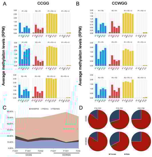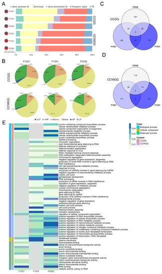 In CCGG sites, the F1221, F1331 and F2332 combination identified 240, 175 and 242 DMGs, respectively, and 149,113 and 152 genes in three combinations, respectively, were identified in CCWGG sites (Figure 4C,D). In sum, 556 and 363 non-redundant genes in CCGG or CCWGG showed non-additive methylation in all cross combinations, and only three genes are commonly found in CCGG and CCWGG context (Figure 3C,D). Moreover, a few genes had multiple non-additive DMSs assigned and these showed different, non-additive patterns among DMSs (Table S3).