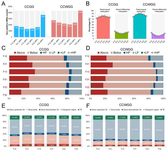 Non-additively methylated sites in all hybrids. (A) The non-additive methylation sites number of all hybrids. (B) Association of non-additive methylation sites with parental methylation status. (C,D) Non-additive categories of methylated sites in all hybrids. These sites were classified when methylation change in all hybrids is identical. “Above” or “Below” means methylation level of one hybrid is greater than two parents or less than two parents of parental equivalent regions. In parental unequal regions, “HP” or “LP” means methylation level of one hybrid is similar to the highest or lowest methylation level, “<LP” or “>HP” means methylation level of one hybrid is lower than in lowest parent or higher than in highest parent. (E,F) The distribution ratio of non-additive sites in three reciprocal hybrids for two methylation contexts.