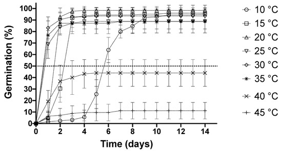 Germination and seedling establishment comprise two critical stages, on which the success of the next generation depends. Germination is affected by temperature, water availability, and gaseous environment [27]. From these environmental parameters, when water availability is not a limitation, temperature is the main factor controlling germination, exerting influence on germination rate, latency level, and seed deterioration rate. Germination rate is mainly affected by temperature because it is related to water absorption by seeds [28,29]. Moreover, biochemical reaction rates underlaying the metabolic networks are affected [30]. In addition, the time at which germination occurs could be affected by temperature [31].
