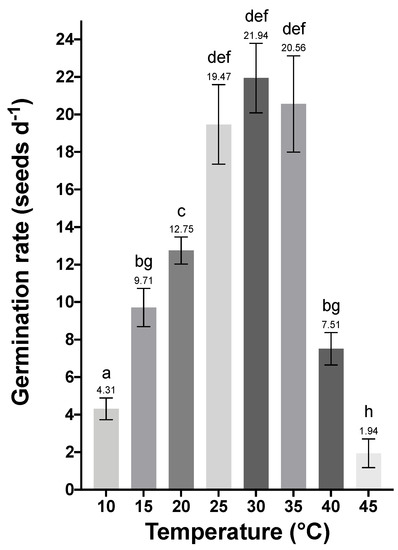 For GR values it was possible to distinguish three different groups: 10–20 °C, where a gradual increase in GR was observed, reaching a plateau at 25–35 °C, and finally 40–45 °C, where a decrease was observed. The highest GR was observed at 30 °C with 22 seeds per day and the lowest at 45 °C with about two seeds per day (Figure 2). Significant differences were observed between the treatments (H (7) = 36.58, p < 0.001 for Kruskal-Wallis test, and p ≤ 0.020 for pairwise Dunn’s test).