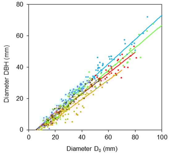 The relationship between diameter at breast height and stem base diameter was described with the following linear function: