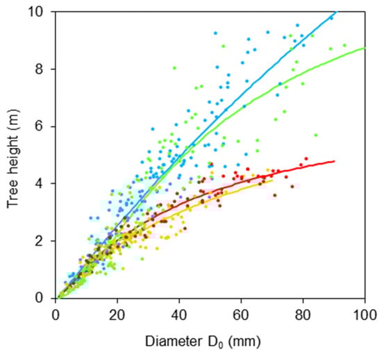 Relationships between tree height and stem base diameter D0 for common aspen (blue), goat willow (orange), rowan (red) and sycamore (green), see Table 2 for formula and statistical characteristics.