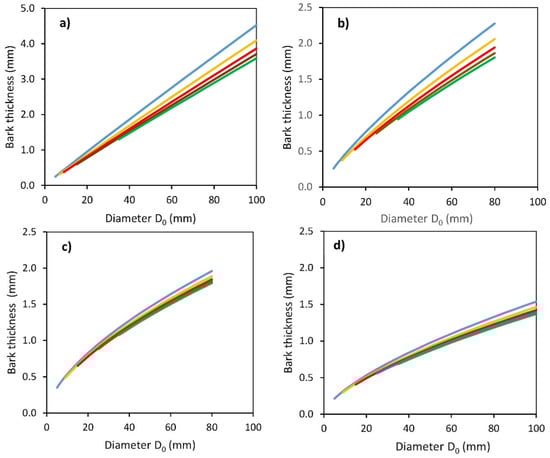 Modeled relationships between bark thickness and stem base diameter D0 for common aspen (a), goat willow (b), rowan (c) and sycamore (d), at different predefined vertical distances Hg from the ground level (blue: Hg = 50 cm, orange: Hg = 100 cm, red: Hg = 150 cm, brown: Hg = 200 cm, green: Hg = 250 cm), see Table 4 for formulas and statistical characteristics of derived regression models.