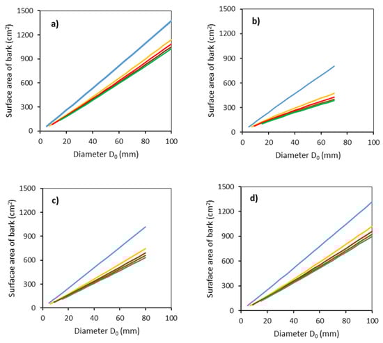 Modeled relationships between surface bark area and stem base diameter D0 for common aspen (a), goat willow (b), rowan (c) and sycamore (d), in separate stem sections defined by the vertical distance from the ground level (blue: 0–50 cm, orange: 51–100 cm, red: 101–150 cm, brown: 151–200 cm, green: 201–250 cm) using Equation (4) and modeled stem radii (Equation (5) and Table 3).