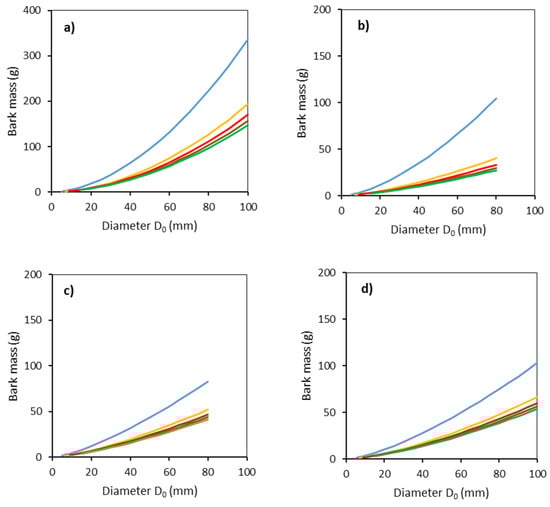 Modeled relationships between bark mass and stem base diameter D0 for common aspen (a), goat willow (b), rowan (c) and sycamore (d), in separate stem sections defined by the distance from the ground level (blue: 0–50 cm, orange: 51–100 cm, red: 101–150 cm, brown: 151–200 cm, green: 201–250 cm) using Equation (6) and modeled stem radii (Equation (5) and Table 3).