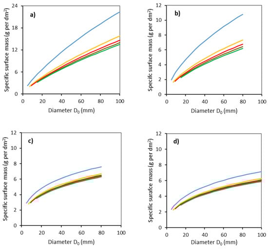 Modeled relationships between specific surface bark mass and stem base diameter D0 for common aspen (a), goat willow (b), rowan (c) and sycamore (d), in individual stem sections defined by the vertical distances from the ground level (blue: 0–50 cm, orange: 51–100 cm, red: 101–150 cm, brown: 151–200 cm, green: 201–250 cm) using Equation (8) and modeled stem radii (Equation (5) and Table 3).