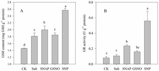 Liu, Y.; Yuan, Y.; Jiang, Z.; Jin, S. Nitric Oxide Improves Salt Tolerance of Cyclocarya paliurus by Regulating Endogenous Glutathione Level and Antioxidant Capacity. Plants 2022, 11, 1157. https://doi.org/10.3390/plants11091157