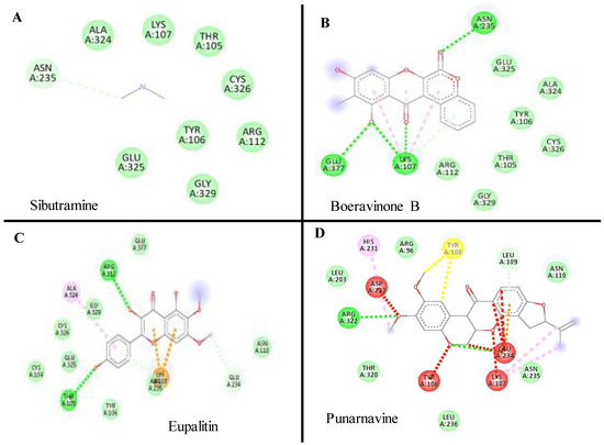 The docked complexes of selected compounds (A) Sibutramine, (B) Boeravinone B, (C) Eupalitin, and (D) Punarvavine with Cannabinoid receptor.