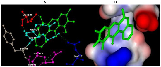 The drug-like properties of Punarnavine, boeravinone B, and Eupalitin were determined following Lipinski’s rule of 5 using the online Molinspiration database (www.molinspiration.com accessed on 5 March 2022) and AdmetSAR. The parameters that were considered were molecular weight (MW), lipophilicity (log P), N atoms, GPCR score, nuclear receptor ligand score, Topological surface area (TPSA), and human oral absorption [26].