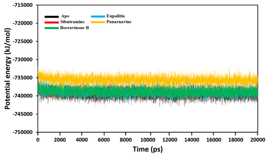 Molecular dynamics simulations were used to evaluate the dynamic stability of ligand complexes with CB1 for the CB1 in complex with sibutramine as a standard compound. The total potential energies of the apo CB1 receptor and in complex with sibutramine, eupalitin, boeravinone B, and punarnavine were computed for 20 ns. It was found that the energy minimization of the initial structure conformations at 0 ps was −739,324.0375, −739,050.4027, −738,899.6695, −738,841.3053, and −735,574.4577 kJ/mol, respectively. Throughout the 20 ns simulation period, the total potential energies of all systems were steady (Figure 7). All CB1 complexes showed a similar potential energy pattern as same as the apoprotein. The CB1-punarnavine complexes had the highest potential energy values than other systems. All complexes were stable and inconsistent with the docking study.