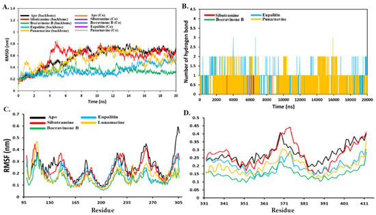 (A) The RMSD of the whole backbone atoms and alpha-carbon atoms (Cα) and for apo CB1 receptor and CB1–ligand complexes. (B) Several hydrogen bonds formed during the period of 20 ns MD simulation. (C) Residue flexibility analysis by RMSF per residue with a focus on 101–300 and in figure (D) at 333–410 residues.