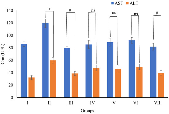 ALT and AST are two classic liver enzymes. They are enzymes that have been used to measure hepatotoxicity [58], particularly ALT, which is present in the cytoplasm of the rat liver. The two enzymes’ activity in the blood has been shown to rise in hazardous environments [59]. For example, ALT has been linked to hepatic fat deposition and insulin resistance, both of which contribute to metabolic syndrome [60]. The HFD obese groups’ ALT and AST activities were considerably (p < 0.01) higher than the normal control group’s [61]. Within the HFD groups, the water fraction significantly (p < 0.01) lowered ALT and AST while the other fractions (Hx-F, Chl-F, and But-F) did not.