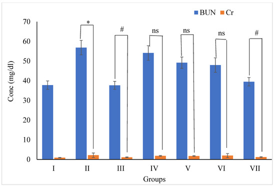 Effects of Wt-F of B. diffusa extract on BUN and creatinine in SD rats after 60 days of treatment. Where BUN = Blood Urea Nitrogen. Data are expressed as Mean ± SEM of 6 rats in each group. p-value = * < 0.01 showed significance compared with respective group I, p-value = # < 0.01 showed significance compared with respective group II and ns = non-significant compared with respective group II.