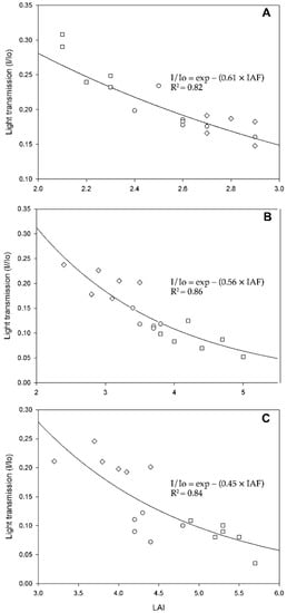Relationship between transmitted radiation and the leaf area index of palms at three planting densities: (A) 4-year-old palms, (B) 6-year-old palms, and (C) 14-year old palms (n = 10). Squares = 143 palms ha−1. Circles = 128 palms ha−1. Diamonds = 115 palms ha−1.