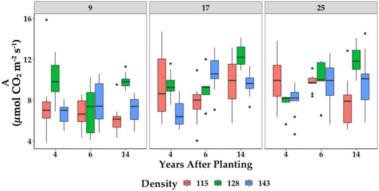 Photosynthetic rate (A) of leaves 9, 17, and 25 in 4-, 6-, and 14-year-old palms planted under three densities (115, 128, and 143 palms ha−1). Each box represents the data of leaves from 10 individual palms.