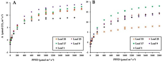 In terms of the photosynthetic response, which in this case measures the highest reachable photosynthesis rate under optimal CO2 concentration with different PPFD, the light response curves of varying-age leaves in 6-year-old (Figure 3A) and 14-year-old (Figure 3B) palms show the highest Amax in Leaf 17 in both cases. However, the Amax was higher in the 14-year-old palms than in the 6-year-old palms. In both cases, the photosynthetic capacity was reduced with the age of the leaf. Thus, the lowest photosynthetic response was measured in the 14-year-old palms in Leaf 33. This is per the photosynthetic rate measured (Figure 2) and is related to the phenology of the leaf [,]. Leaf 1 is very young and not always fully expanded. From Leaf 9, the metabolic status of the leaves is more stable, and it is generally accepted that the metabolic peak is reached in Leaf 17, with a slight decrease in Leaf 25, but with strong signs of senescence in Leaf 33 [].
