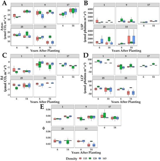 Parameters of photosynthetic performance derived from light response to curves of leaves 1, 9, 17, 25, and 33 (panels). YAP = years after planting, (A) Amax = maximum photosynthetic rate, (B) LSP = light saturation point, (C) Rd = dark respiration, (D) LCP = light compensation point, (E) φ = Quantum yield of photosynthesis. The color of each box plot represents a different planting density in plants per ha, red = 115; green = 128; blue = 143 (n = 6).