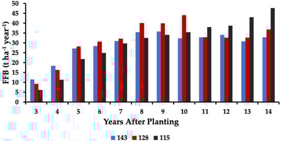 The cumulative FFB yield for the 14 years was 350.5 t ha−1 for 143 palms ha−1, 375.3 t ha−1 for 128 palms ha−1, and 363.2 t ha−1 for 115 palms ha−1. These results translate into 2.45 t palm−1 for 143 palms ha−1, 2.93 t palm−1 for 128 palms ha−1, and 3.16 t palm−1 for 115 palms ha−1. The palms planted at 115 palms ha−1 produced more FFB in the 14 years of the study, but the lower number of palms implies lower maintenance costs, which could increase the profitability of the crop [].