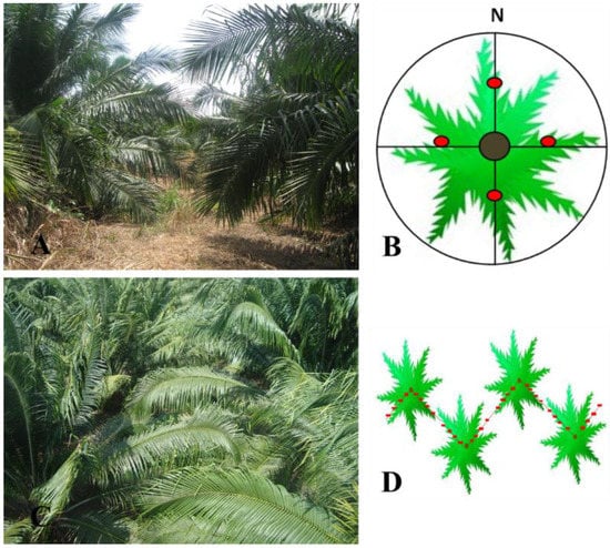 Sampling methods were used to determine intercepted solar radiation: (A) appearance of plots of three-year-old palms, (B) circular sampling system, (C) appearance of plots of five-year-old palms, (D) triangular sampling methods.