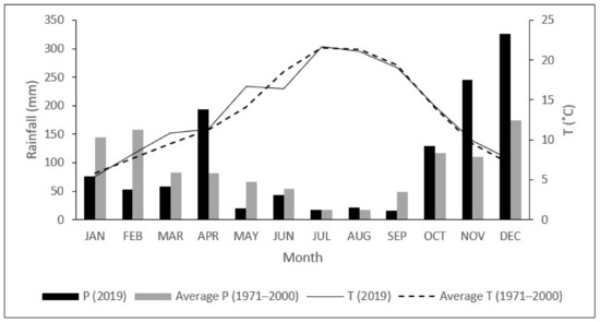 Average monthly Temperature (T, °C) and rainfall (P, mm) in 2019 and 1971–2000.