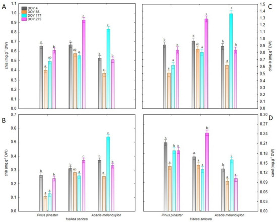 (A) Chlorophyll a (chla), (B) chlorophyll b (chlb), (C) total chlorophyll (chla+b), and (D) carotenoid (carrot) contents in leaves of all analyzed species (Pinus pinaster, Hakea sericea and Acacia melanoxylon) on the four sampling dates. For each species, different lowercase letters indicate significant differences between day of the year (DOY) according to the Tukey’s HSD test results.