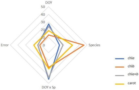 Based on the results of the two-way repeated measures ANOVA, Species and the DOY × Species interaction jointly explained 58.6% to 75.0% of the observed variation in photosynthetic pigments (Figure 3).
