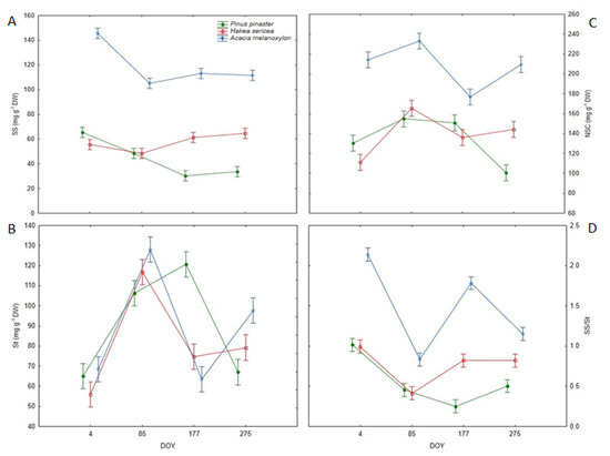 Analyses further revealed temporal variations among the examined species, as indicated by the significant DOY × Species interactions (Table 2, Figure 4). Overall, SS content in Pinus pinaster and Acacia melanoxylon was the highest on DOY 4 and decreased thereafter, whereas in Hakea sericea, the highest SS content was determined on DOY 177 and DOY 275 (Figure 4). The St content in the native tree exhibited an upward trend from DOY 4 to DOY 177 and declined by about 50% on DOY 275, reaching a similar value to that measured on DOY 4. In turn, St content in Hakea sericea increased from DOY 4 to DOY 85, after which it declined by about 36%, as measured on DOY 177 and DOY 275. In Acacia melanoxylon, following a 1.9-fold increase from DOY 4 to DOY 85, St content decreased by about 50% on DOY 177 and increased again on DOY 275 to 97.73 mg g−1 DW. The NSC content in both IAS showed a trend that mirrored the pattern observed for St. In Pinus pinaster, NSC content increased from DOY 4 to DOY 177, and was significantly lower on DOY 275 (Figure 4). The mean SS/St ratio was consistently higher in Acacia melanoxylon compared to the other species (Figure 4). Both IAS presented the highest ratio on DOY 4 and the lowest on DOY 85. In the native species, a significant variation in the SS/St was noted, with the highest value (DOY 4) 2.4-times greater than the lowest value (DOY 177).