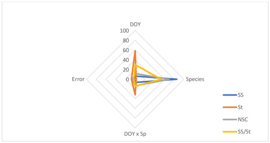 The decomposition of variance by sources of variation indicated that Species explained 69.8–85.3% of the variation found in SS, NSC and SS/St, while DOY was the major source of variation in St, explaining about 59% (Figure 5).