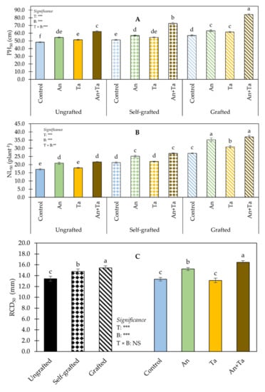 ANOVA for NL50 exhibited a significant effect of the T × B interaction (Figure 1B). ‘Birgah’ F1 grafted eggplants treated with An or An+Ta had the highest NL50, followed by those grafted and supplied with Ta. The lowest NL50 was found in untreated plants (control) and in ungrafted plants treated with Ta.