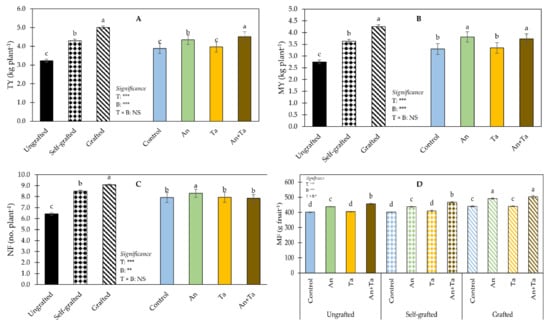 No significant T × B interaction was found for TY (Figure 2A). Grafted plants revealed the highest TY, followed by self-grafted plants, whereas ungrafted plants had the lowest TY. Irrespective of the type of plant, plants treated with An+Ta revealed the highest TY, followed by those supplied with An. Untreated plants and those treated with Ta had the lowest TY.