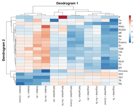 Heat-map analysis revealed two dendrograms. Dendrogram 1 was placed on the top, encompassing the groupings of type of plant and biostimulant, and Dendrogram 2, sited on the left, involving the studied parameters that affected this distribution. Dendrogram 1 showed two main groups; the group on the left side involves all combinations with grafted plants (grafted × control, grafted ×Ta, grafted × An, and grafted × An+Ta). The other, located on the right, includes all combinations with ungrafted and self-grafted plants. Explicitly, in the left cluster of Dendrogram 1, the grafted × control and grafted × Ta combinations were separated from the combinations grafted × An and grafted × An+Ta due to the lower P, Ca, PH50, RCD50, MF, AA, Cu, proteins, Zn, ClA, Fe, K, NL50, TA, and Mg. The cluster on the left comprised the grafted × control and grafted × Ta combinations. Inside this cluster, the grafted × control combination was evidently parted by lower PH50, FDM, K, NL50, SSC, and Mg. The cluster on the right enclosed the grafted × An and grafted × An+Ta combinations. Within this group, the grafted × An+Ta combination was separated by a higher PH50, RCD50, MF, AA, FDM, K, NL50, and Mg.