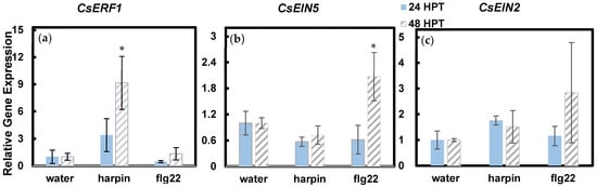 3.2. Harpin and Flg22 Upregulate Certain Expression of Ethylene-Responsive Genes and Defense Genes