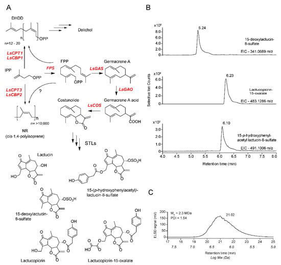 Biosynthetic pathways and metabolite analysis of NR and STLs in lettuce latex. (A) Biosynthetic routes of diverse secondary isoprenoids in lettuce latex. (B) STL detection in lettuce latex by LC-qTOF. [M+H]+ ions were detected in positive ion mode. (C) NR detection in lettuce latex by HPLC-GPC (gel permeation column)-ELSD (evaporative light scattering detector). Abbreviations used are: DHDD, dehydrodolichyl diphosphate; STL, sesquiterpene lactone; NR, natural rubber; IPP, isopentenyl diphosphate; FPP, farnesyl diphosphate; PDI, polydispersity index. The key enzymes for each biosynthetic pathway are labeled in red. Representative STL products are shown. Schemes follow the same formatting.
