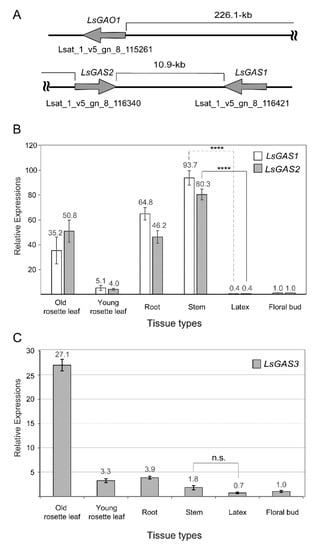 Genomic cluster and expression analysis of LsGAS. (A). Schematic representation of LsGAS1, LsGAS2, and LsGAO1, retrieved from Phytozome. (B,C). qPCR analyses of LsGAS1/2 (B) and LsGAS3 (C) in various lettuce tissues. Young rosette leaves were collected 10–14 days after germination; old rosette leaves were collected 4–6 weeks after germination. The transcript level in floral buds was set to one, and all other values were relative to the floral bud transcript level. Stem samples used whole stem tissues including latex. Data are means ± S.D. (n = 4). **** indicates a p value of < 0.0001; n.s. indicates no statistical significance, p value >0.05.