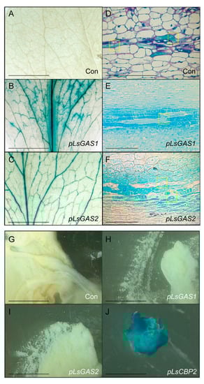 Cell-type specific expression of LsGAS1/2 was more precisely analyzed by characterizing their promoter activities. The LsGAS1/2 promoters, each consisting of a ~1 kb fragment upstream of their ATG start codons, were identified from the lettuce genome. These promoters are hereafter referred to as pLsGAS1 and pLsGAS2. The promoter fragments were transcriptionally fused to the reporter gene, β-glucuronidase (GUS). The promoter-GUS constructs and vector controls were individually transformed to lettuce, and a total of eight and twelve independent T1 lines were generated using the pLsGAS1-GUS and pLsGAS2-GUS constructs, respectively. Leaves from T1 lines were infiltrated with X-Gluc, and two lines for each construct that showed particularly strong GUS signals were selected to propagate the T2 generation for further analysis.