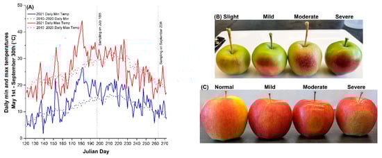 Sunburn browning (SB) of ‘Ambrosia’ apple due to sustained heat in the summer of 2021 at the Summerland experimental farm, the Okanagan Valley, British Columbia, Canada: (A) the daily maximum and minimum air temperatures in May to September of 2021 and 2010–2020 average; (B) the severity of sunburn browning symptoms in ‘Ambrosia’ apple fruit sampled on 16 July (Julian Day 197); (C) the progression of SB symptoms in mature apples sampled on 20 September (Julian Day 263).