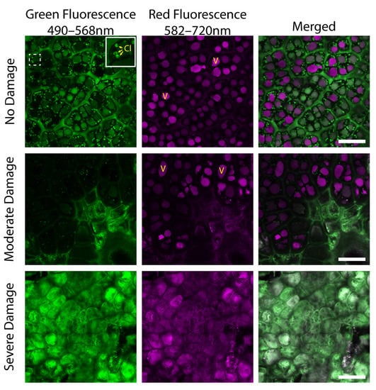 Due to their autofluorescent nature, many plant compounds can easily be observed using a confocal microscope, with little to no sample preparation. With this in mind, we sought to characterize any changes in chlorophyll and anthocyanin content at the subcellular level in apple SB damaged skin cells. Chlorophyll autofluorescence within chloroplasts (Figure 2, Cl and insert) were clearly seen within the green fluorescence channel of undamaged cells and to a lesser extent in moderately damaged living cells. Anthocyanin autofluorescence within vacuoles (V) was seen in the red fluorescence channel, in both undamaged cells and living cells, in moderately damaged tissue. In severely damaged or dead cells, no characteristic chlorophyll or anthocyanin signal was observed. Interestingly, these collapsed dead cells in damaged tissue accumulated an autofluorescent compound or compound conjugate that exhibited intense fluorescence in both the green and red channels. Though not identified in this study, this compound displays fluorescence characteristics similar to many stress-related compounds.