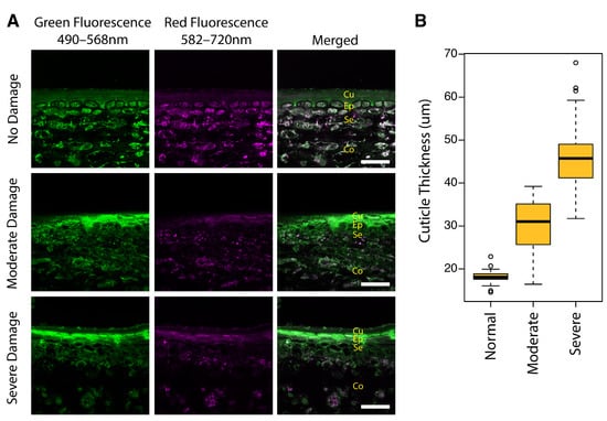 Sunburn damage results in the death and collapse of several layers of subepidermal cells and the increased thickness of the cuticular layer: (A) confocal micrographs of transverse sections of ‘Ambrosia’ apple peels exhibiting no, moderate, and severe sunburn browning damage. Cu, cuticle; Ep, epidermal tissue; Se, subepidermal tissue; Co, cortex. Scale bars = 50 µm; (B) Boxplot of measurements of cuticular thickness in the sun-exposed skin with no, moderate, and severe sunburn browning damage, as measured from the edge of the cuticle to the first living cell layer (n = 50 measurements from 10 micrographs each; circles represent outliers).