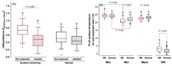 Fruit skin spectral characteristics of normal and sunburn browning (SB) ‘Ambrosia’ apple measured prior to harvest in 2021: (A) delta absorbance IAD 670–720 nm of sun-exposed and shaded sides measured two weeks prior to harvest; (B) maximum (Tmax), minimum (Tmin), mean (Tmean), and differential (Tdiff) skin surface temperatures of sun-exposed side measured in late August. Different letters a and b in each pair of SB-normal comparisons stand for statistical significance at p ≤ 0.05 (ANOVA); statistical significance between Tmax and Tmin of the same fruit type was shown in brackets (ANOVA, Tukey pairwise comparison).