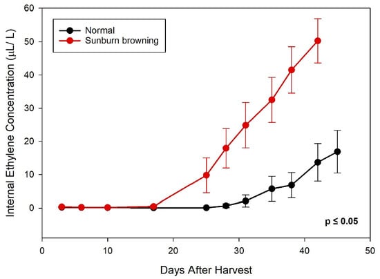 Changes in internal ethylene concentration of normal and sunburn browning ‘Ambrosia’ apples during air storage at 20 °C. Dots and error bars are mean ± standard deviation (n = 15).